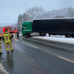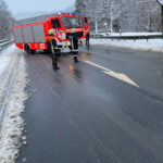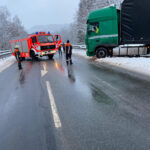 Hierzu haben wir die Verkehrsabsicherung übernommen und die B173 kurzzeitig voll gesperrt. Als der Bergungsversuch der Spedition scheiterte und der feststeckende LKW sich in Schieflage begab und Richtung Straßengraben rutschte, haben wir diesen mittels Seilwinde des RW stabilisiert und letztlich auf die geräumte Straße gezogen.