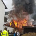 Zu einem Brand einer Scheune wurde die FF Wallenfels am 05.04.2017 um 16.51 Uhr alarmiert. Die Leitstelle hatte B5 ausgelöst. Bereits beim Eintreffen der Ortswehr stand in der Bahnhofstraße das Dachgeschoß eines eingeschoßigen Nebengebäudes zum größten Teil im Brand. Eine Person wurde als vermisst gemeldet. Die Wallenfelser Wehr übernahm die Brandbekämpfung von der linken Seite aus mittels des HLF, unterstützt durch die Besatzung des Rüstwagens. Eine Wasserversorgung wurde der Wehr durch die Feuerwehren Nurn und Neufang vom Bach aus aufgebaut. Das LF 8 aus Wallenfels unterstützte bei der Brandbekämpfung von der rückwärtigen Gebäudeseite aus. In der Ankerstraße wurde dafür die Wasserentnahme vom Bach durchgeführt.
