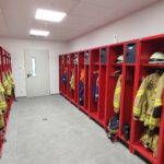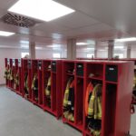 Die Umkleiden sind über einen separaten Alarmeingang und Alarmflur direkt vom Alarmparkplatz aus erreichbar. Baulich wurde dies wie folgt gelöst: Die Ausfahrt der Einsatzfahrzeuge erfolgt auf der Südost Seite des Gebäudes. Die Alarmparkplätze wie auch der Alarmeingang befinden sich auf der Nordost Seite des Gebäudes. Dadurch wird ein Kreuzungsverkehr zwischen ausfahrenden Einsatzfahrzeugen und ankommenden Einsatzkräften vermieden. Im Alarmflur befindet sich ebenfalls ein Alarmmontitor mit allen einsatzrelevanten Daten. Die Schwarz-Weiß Trennung in den Umkleiden erfolgt zum einen über organisatorische Maßnahmen und zum anderen auch über Spinde mit entsprechendem Einsatz- und Privatabteil.
